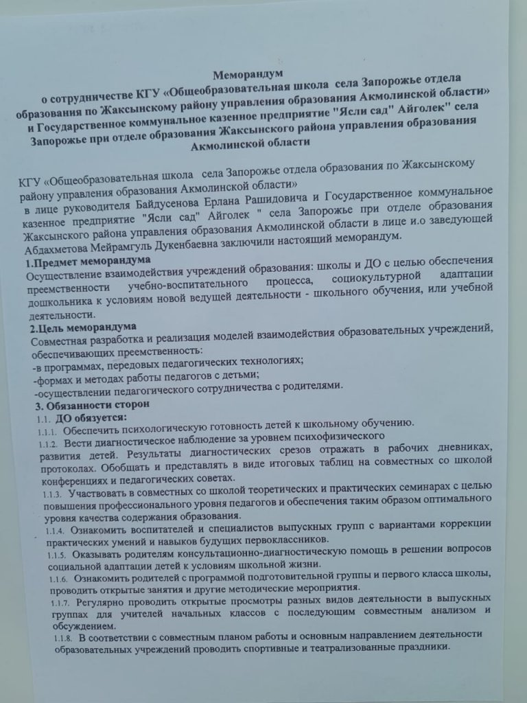 "Ақмола облысы білім басқармасының Жақсы ауданы бойынша білім бөлімі Запорожье ауылының жалпы білім беретін мектебі" КММ және Ақмола облысы білім басқармасының Жақсы ауданы бойынша білім бөлімінің Запорожье ауылының "Ясли сад" Айгөлек" мемлекеттік коммуналдық қазыналық кәсіпорны ынтымақтастық туралы Меморандум