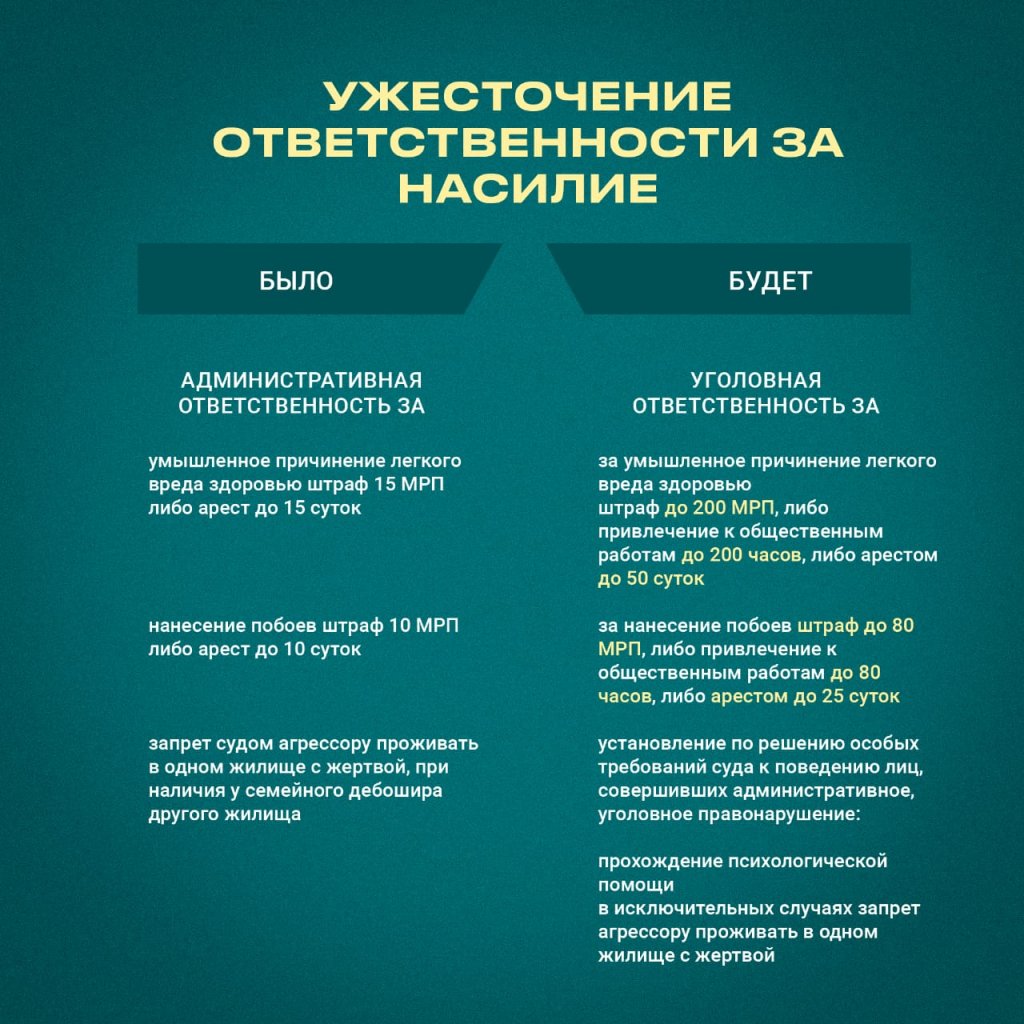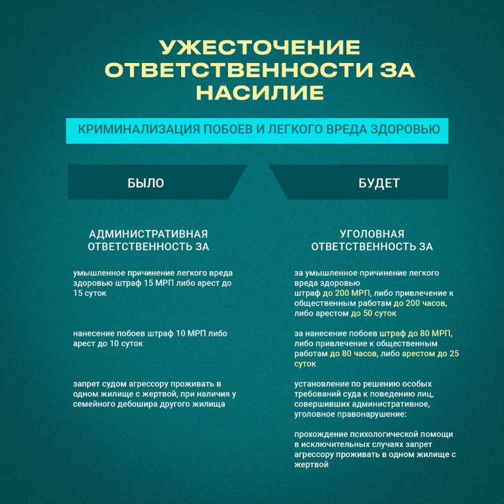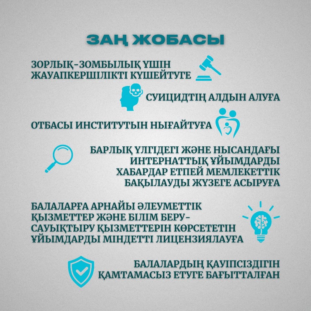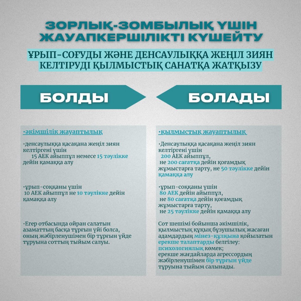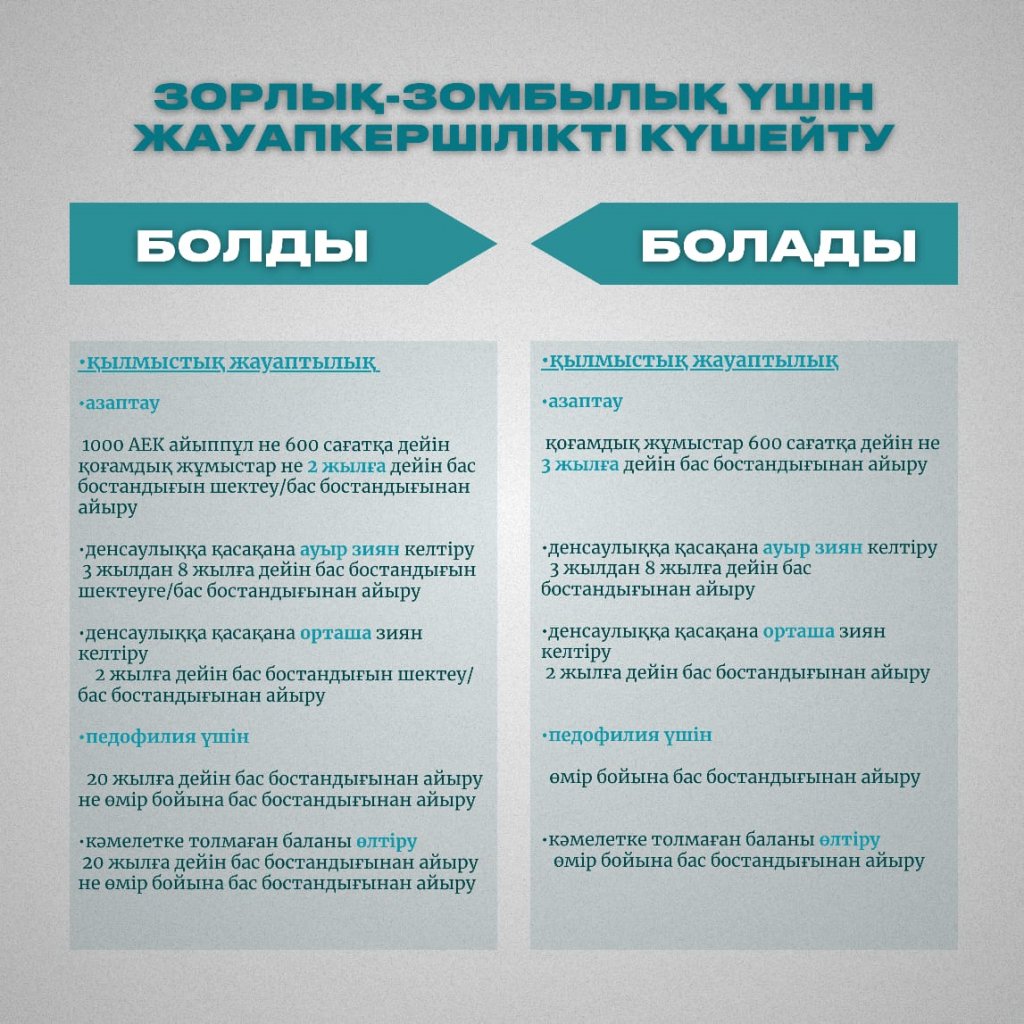 Мемлекет басшысы 2022 жылғы 16 наурыздағы және 2023 жылғы 1 қыркүйектегі Қазақстан халқына арнаған жолдауларында әйелдер мен балаларға қатысты зорлық-зомбылық үшін жазаны қатаңдатуды тапсырғанын еске сала кетейік.