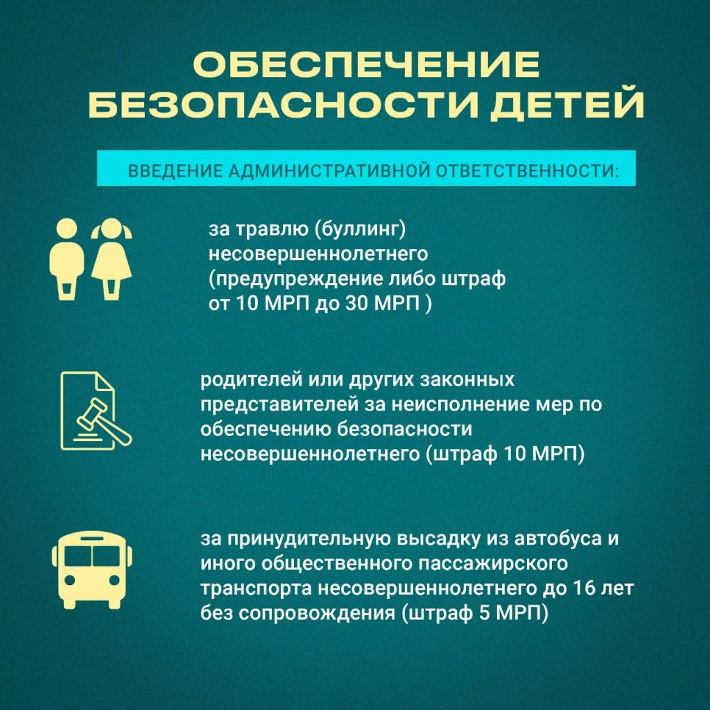 Президент Қасым-Жомарт Тоқаев «Қазақстан Республикасының кейбір заңнамалық актілеріне әйелдердің құқықтары мен балалардың қауіпсіздігін қамтамасыз ету мәселелері бойынша өзгертулер мен толықтырулар енгізу туралы» және «Қазақстан Республикасы Әкімшілік құқық бұзушылық туралы кодексіне әйелдердің құқықтары мен балалардың қауіпсіздігін қамтамасыз ету мәселелері бойынша өзгерістер мен толықтырулар енгізу туралы» Қазақстан Республикасының заңдарына қол қойды.
